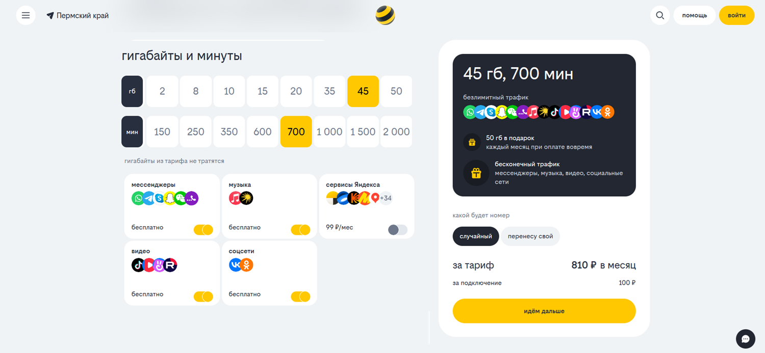 Третий вариант — тариф “План б”. Он позволит существенно экономить на использовании не только основных услуг сотовой связи, но и на цифровых сервисах. Месячная стоимость составляет от шестисот рублей при подключении в Перми – тариф также настраиваемый.